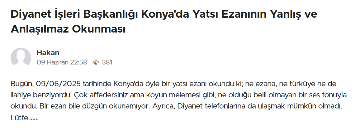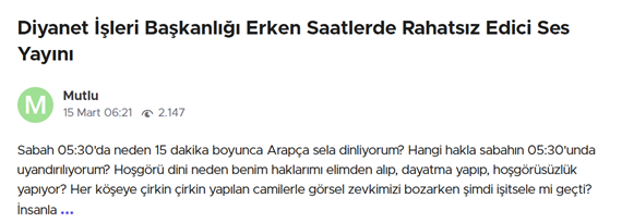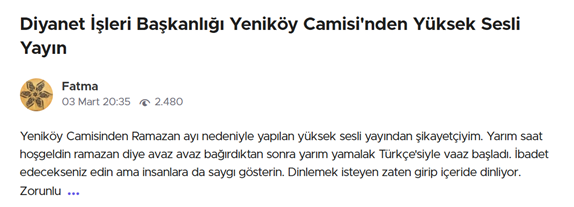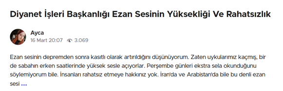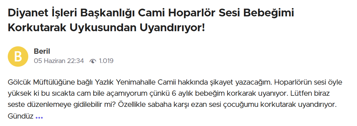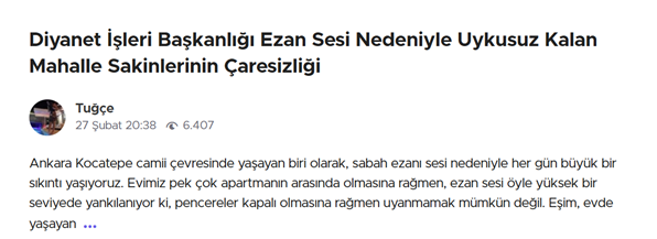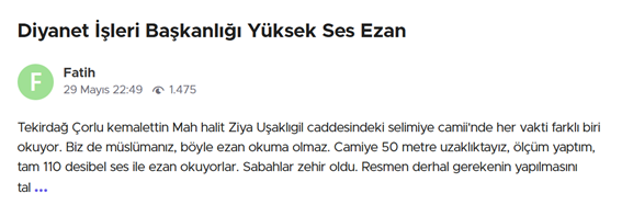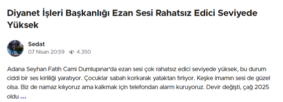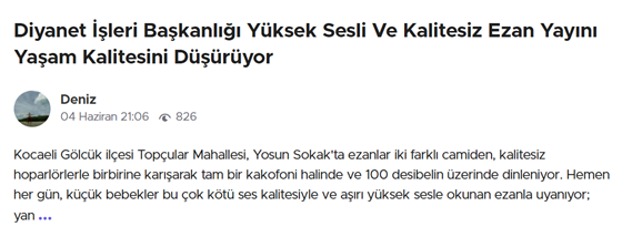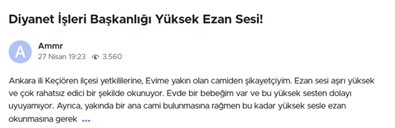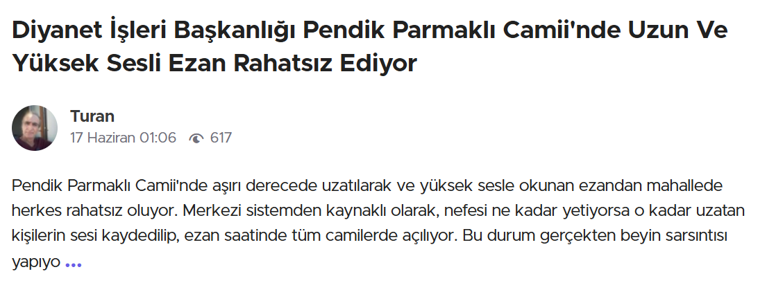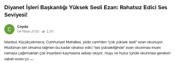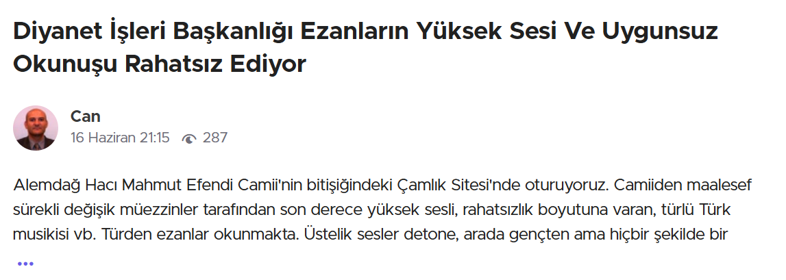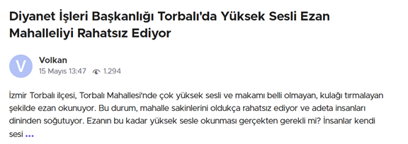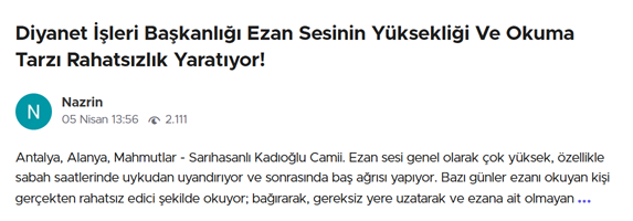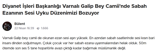 sikayetvar.com internet sitesinde ezan sesinden duyulan rahatsızlıklara karşı yüzlerce insanın yazdığı yorumlardan bazılarını paylaşmak istiyorum ve bunların kimileri de kendilerini müslüman olarak adlandırıyor, yani kimi müslümanlar bile rahatsız bu durumdan...